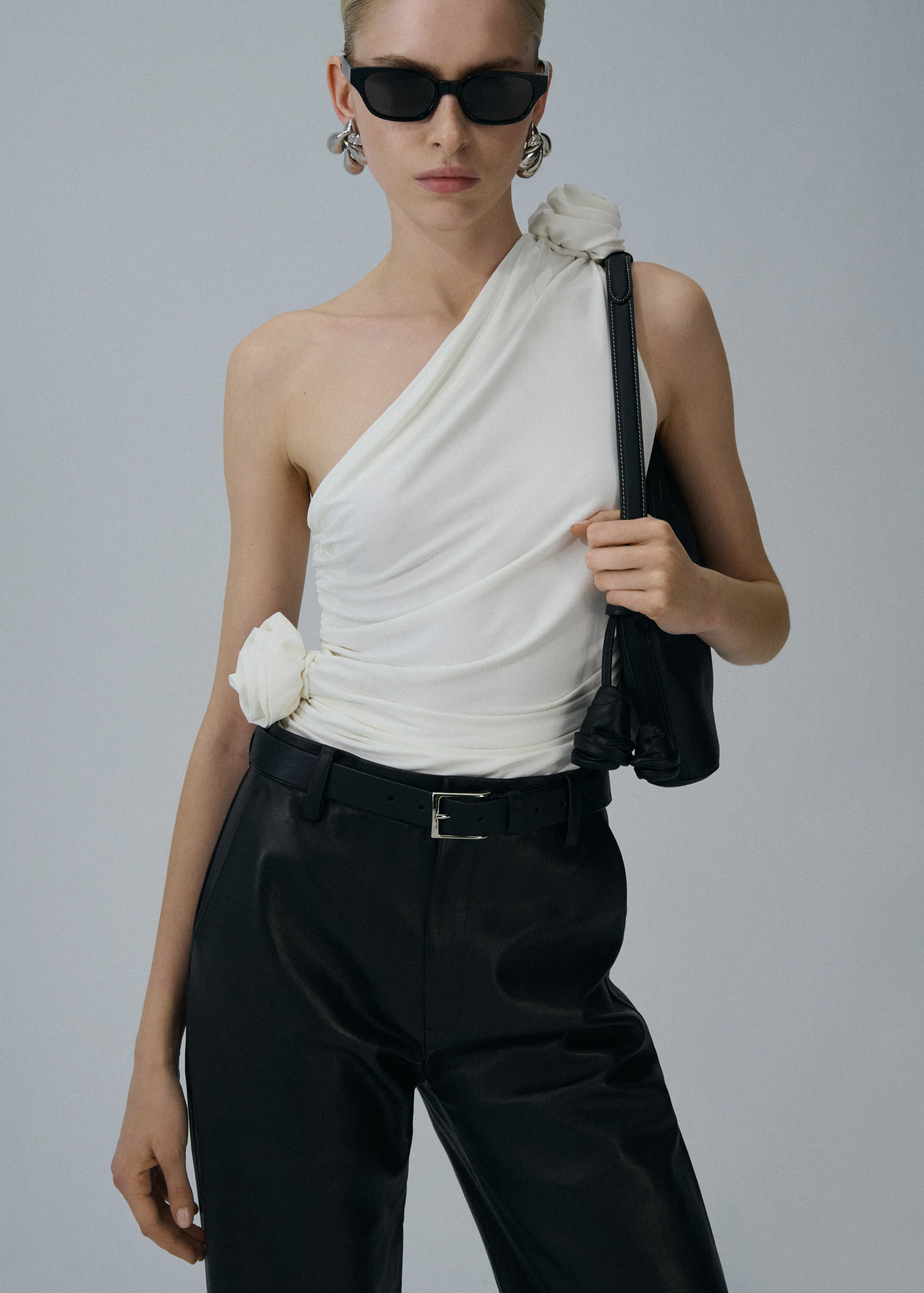 Magda reinvisions the classic tshirt in a totally modern way: a lightweight one shoulder asymmetrical top with ruched detailing and 3D cotton roses.