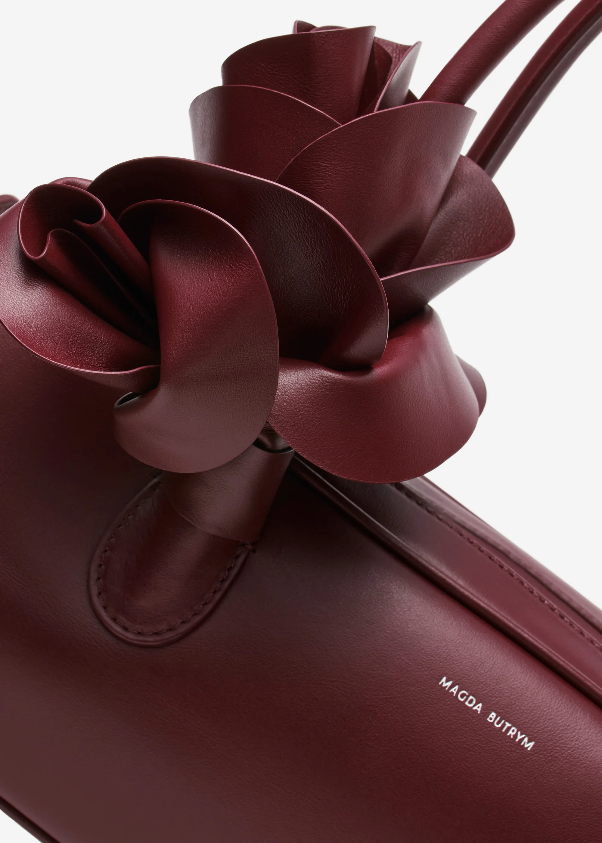 The trapeze-shaped Brigitte bag in burgundy leather, inspired by 90s nostalgia and crafted in Italy, with a spacious interior, two top handles, and top zipper, accented by a meticulously arranged floral leather embellishment on the handle.