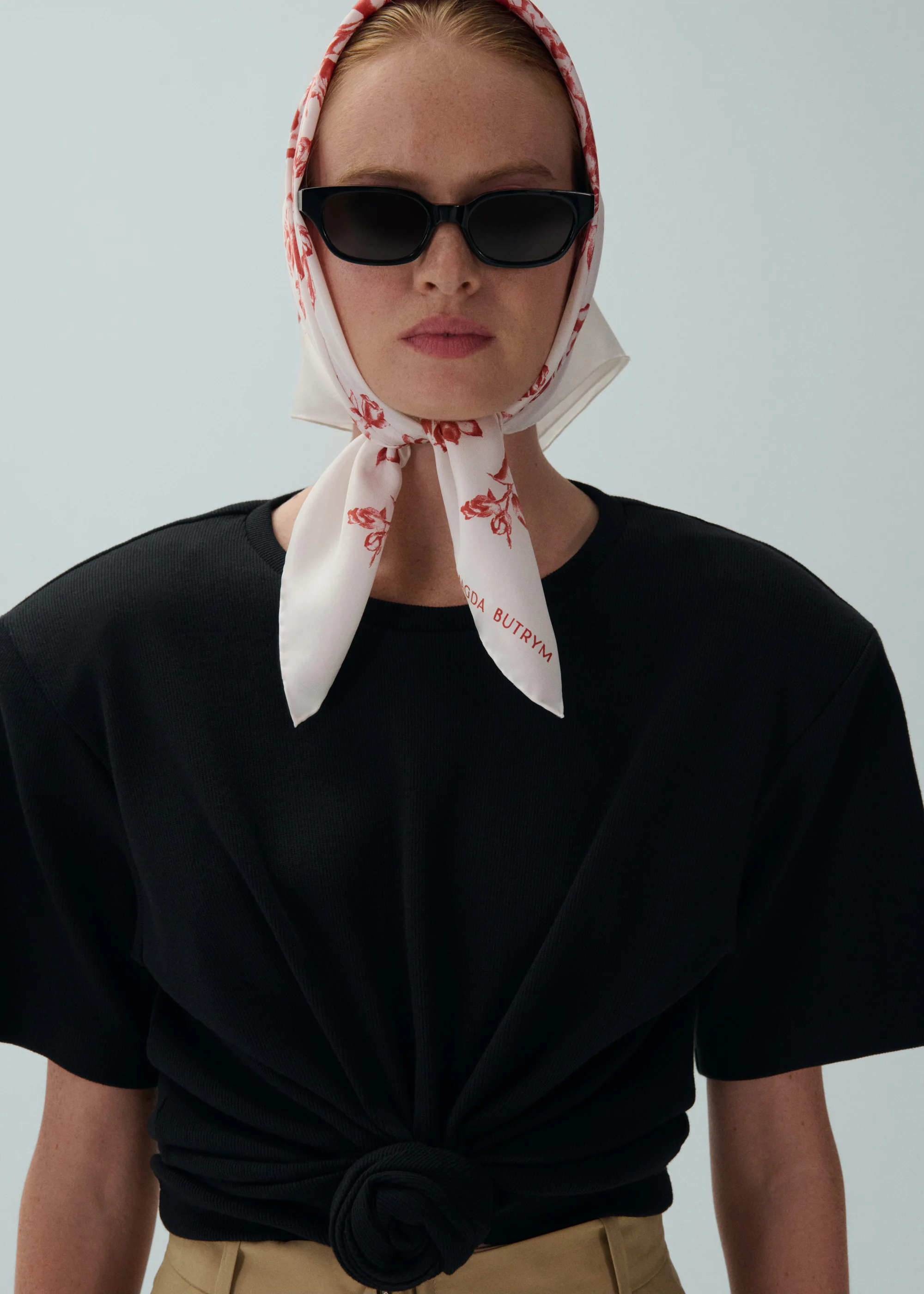 Magda's classic ribbed t-shirt features a knotted detail at the front and detachable shoulder pads.