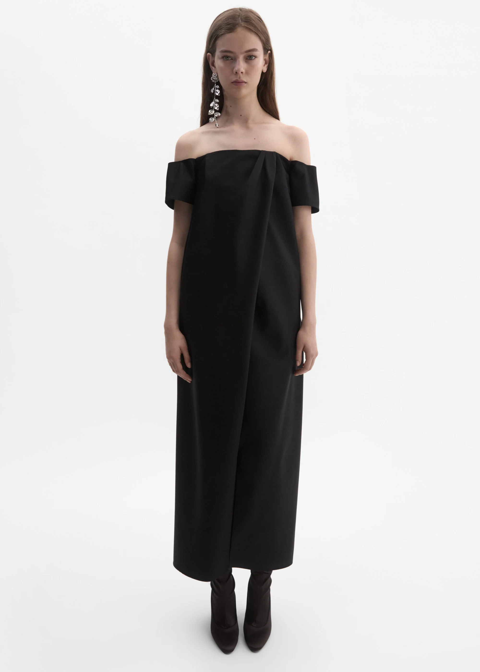 A graceful ankle-length dress cut from a luxurious wool-silk blend with a smooth, fluid drape. The design features a straight neckline supported by an internal corset. The softly draped, off-shoulder sleeves are secured with elastic bands. Subtle darts sculpt the waist and hips, while concealed side-seam pockets add functionality. Closes at the center back with a hidden zipper and a slit below for ease of movement.