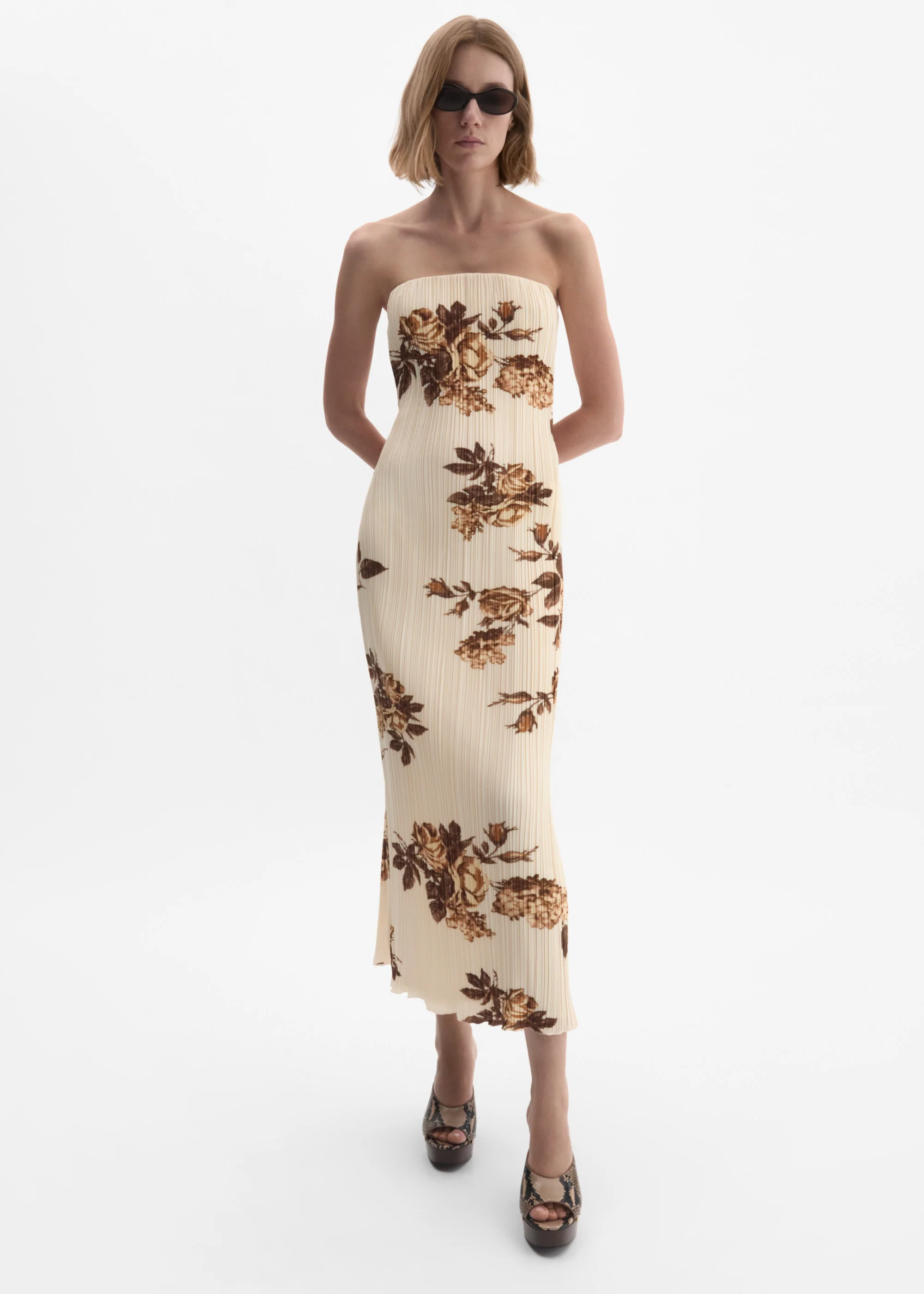 A sleek, midi dress crafted from a lightweight printed fabric featuring vintage-inspired florals. The silhouette is long and straight with a gently defined waist. The straight, strapless neckline is reinforced with an internal mesh corset that provides structure and support while maintaining a soft, seamless finish. The dress fastens with a concealed zipper at the center back and includes a subtle slit for movement. Fully lined with a fine cupro fabric for comfort.