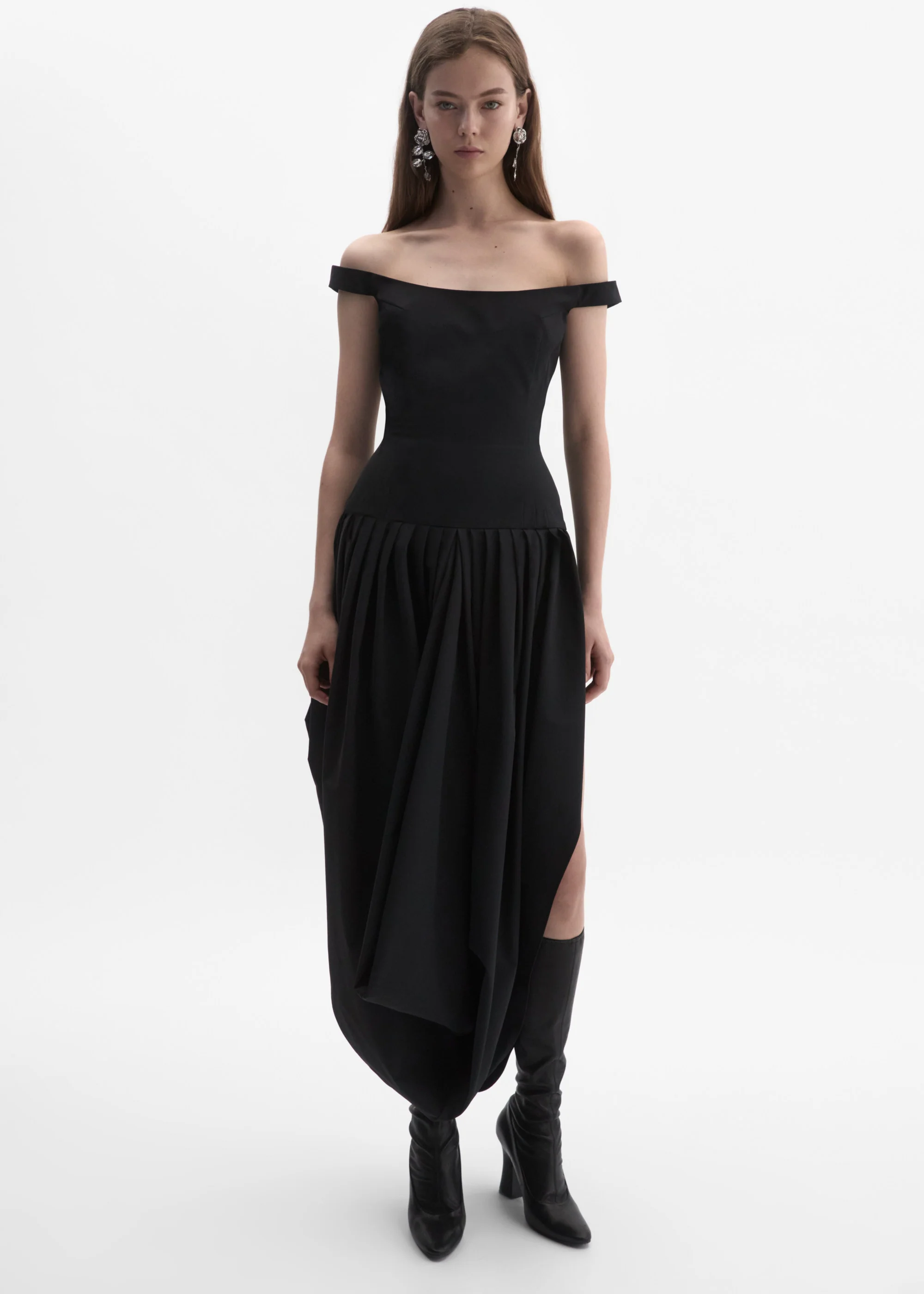 Long off-shoulder draped dress in black