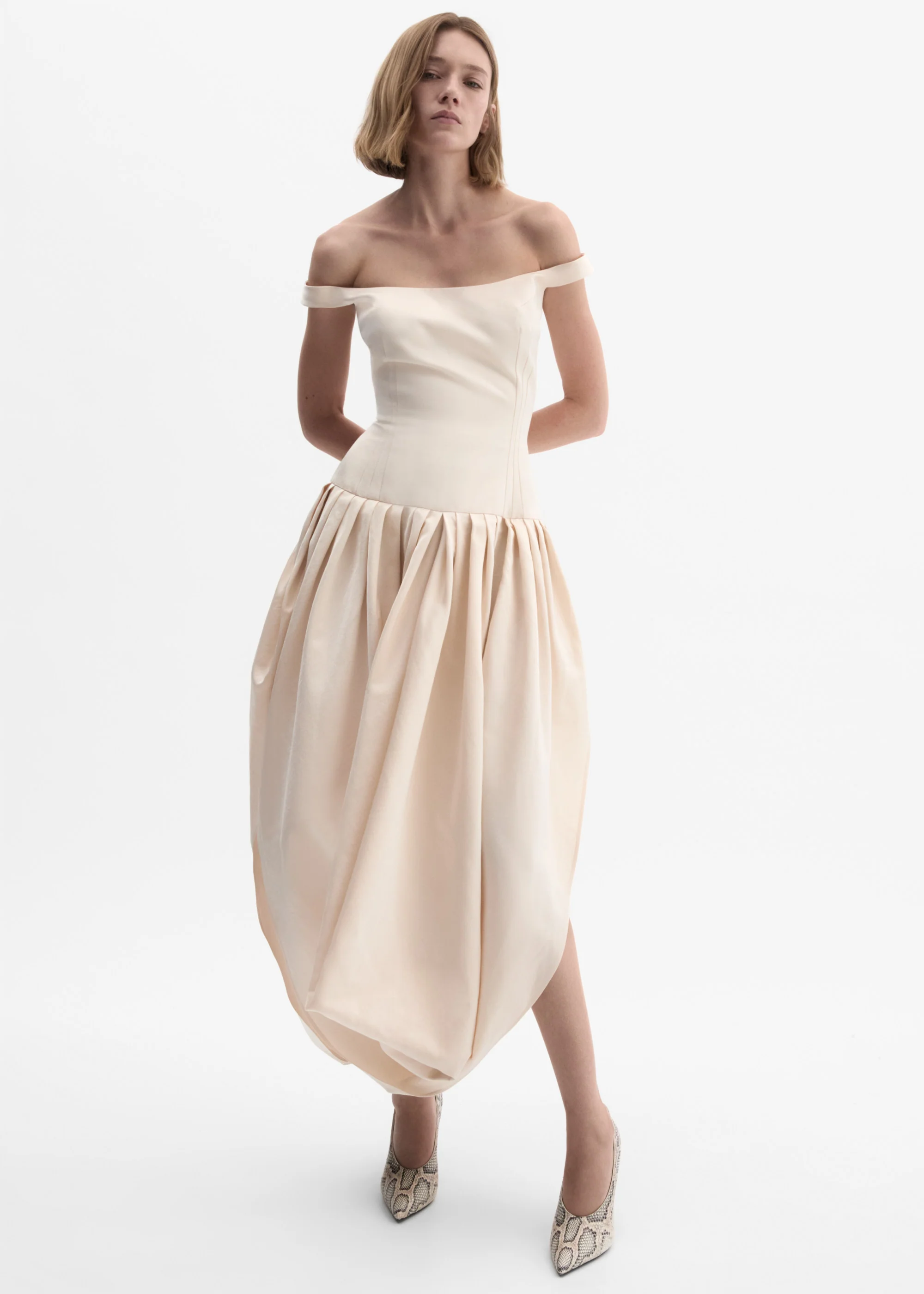 An elegant off-shoulder gown that combines a fitted bodice with sculptural draping. Crafted from cotton and silk. The upper silhouette is precisely tailored with contouring darts to accentuate the waist, while the wide neckline softly frames the shoulders. Below the hips, the voluminous skirt unfolds in asymmetric pleats and rounded side drapes. Finished with discreet side pockets, a concealed back zip, and a fully lined bodice for structure and comfort—modern romance with timeless couture refinement.