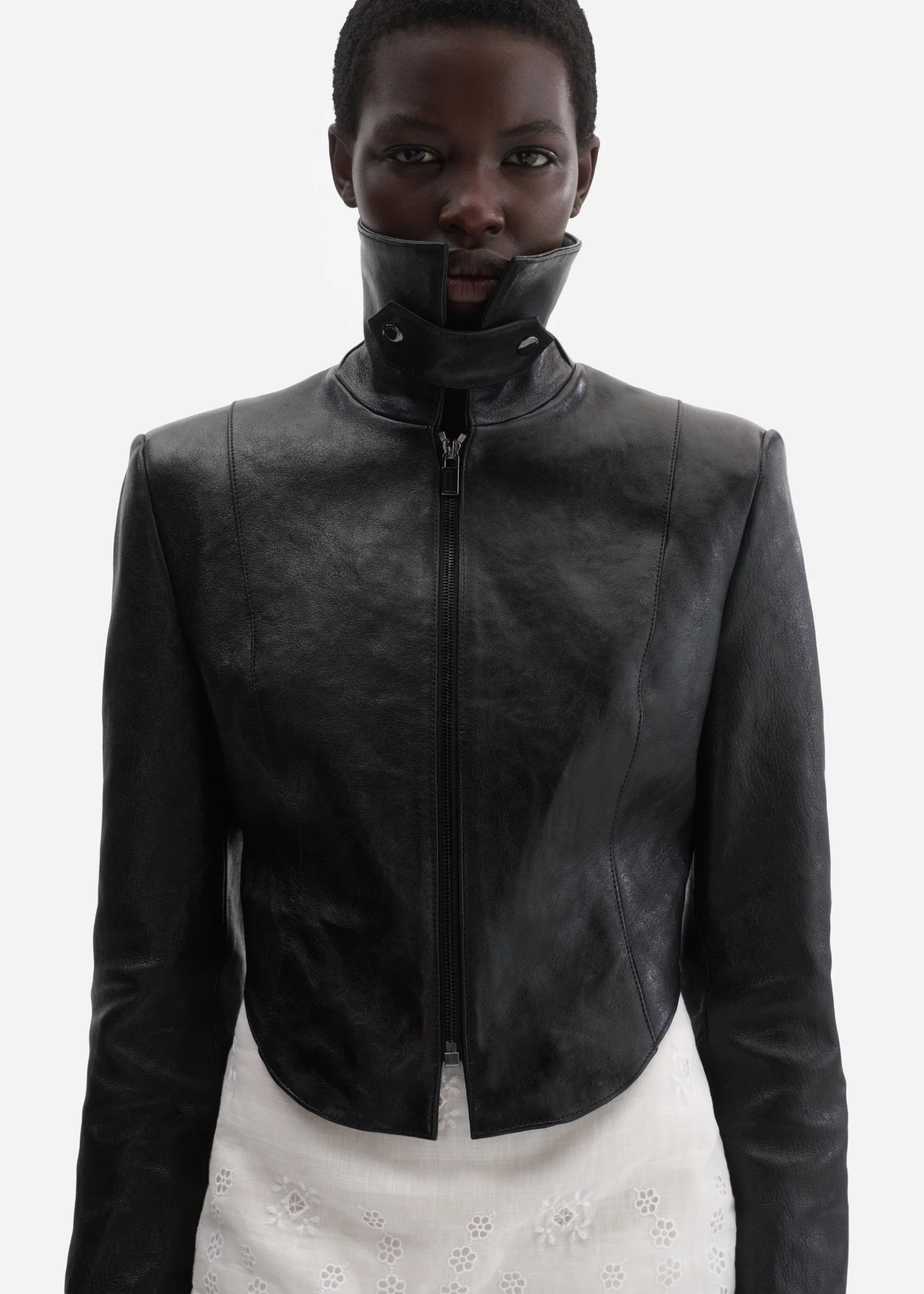 This cropped leather jacket features a sleek zip closure, long sleeves with buttoned cuffs, and precisely tailored seams that contour the body. The pointed collar can be worn flat or pulled up and fastened with a snap closure for added styling versatility. A gently curved hem defines the waist.
