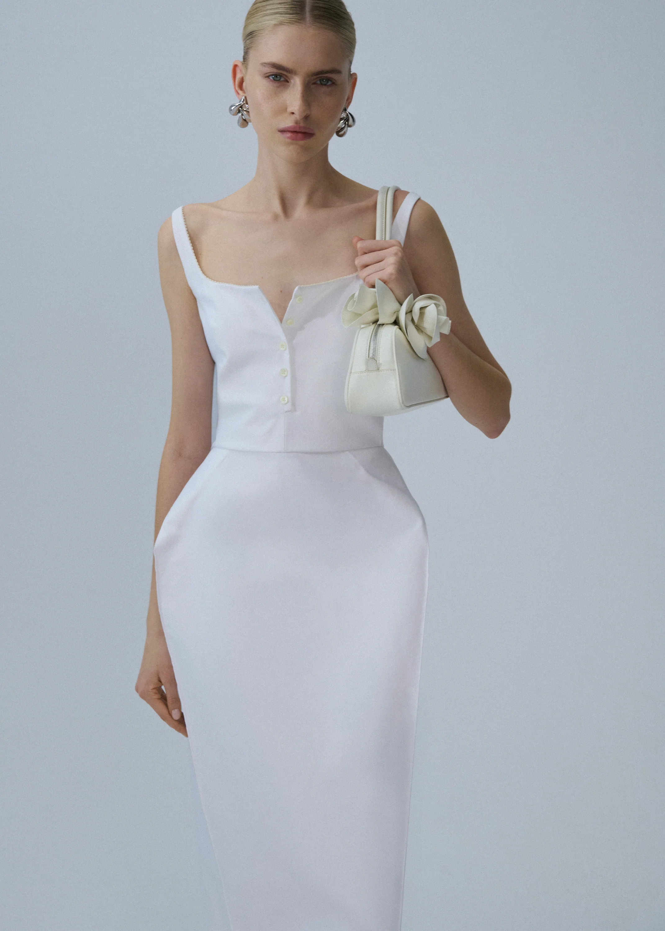 The Brigitte bag gets a new trapeze shape. Inspired by the nostalgia of 90's while deeply rooted in Magda's family heritage. Its elegant silhouette, the roomy interior, two top handles and top zipper have been thoughtfully crafted in Italy. Adding a touch of on-brand dreaminess is the leather flower embellishment. Meticulously arranged and fixed onto the bag's handle. For an ideal finish curl the flower petals outward for a blooming rose effect on your bag.