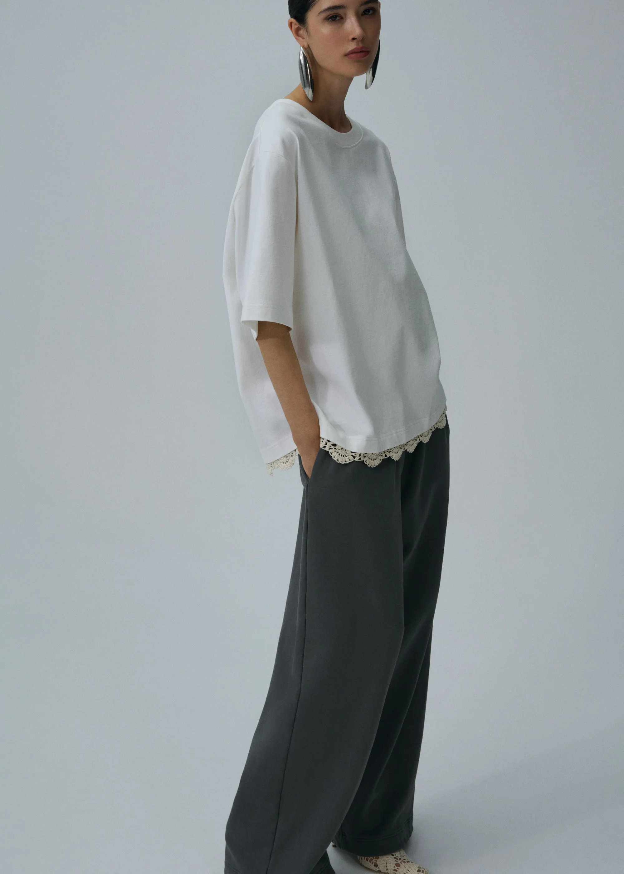 An oversized t-shirt made from cotton with a lace crochet detail at the hem.