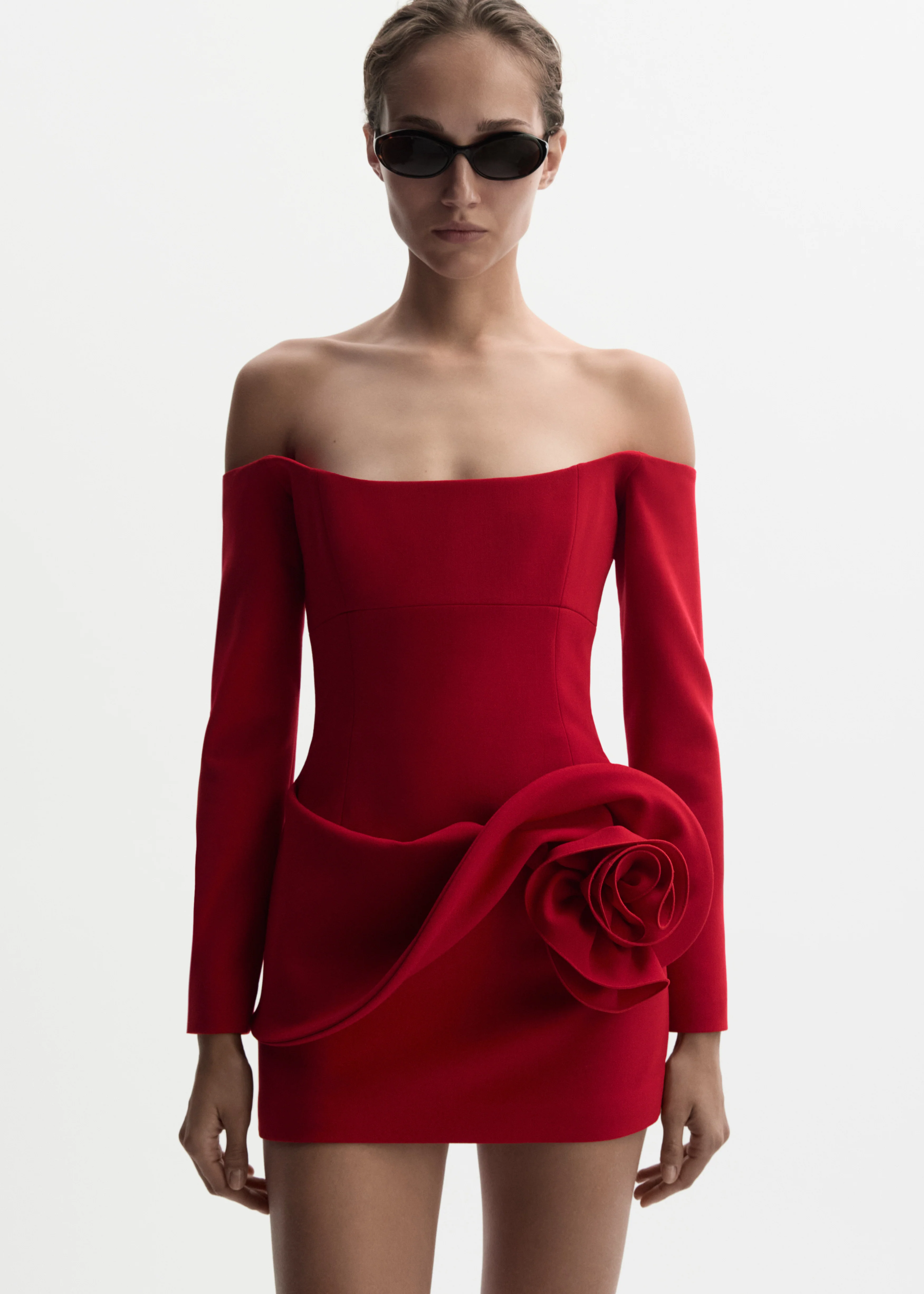 A sculptural mini dress designed with a straight neckline and exposed shoulders, balanced by long fitted sleeves. The bodice is reinforced with an internal corset that defines the waist and enhances the silhouette. A softly draped overlay is placed at the hip, while a sculptural hand-folded flower adorns the left side of the skirt, adding a signature romantic accent. The interior waist is stabilized with a decorative lace-trimmed tape and lingerie-style fastening. Fastens at the center back with a concealed zipper.
