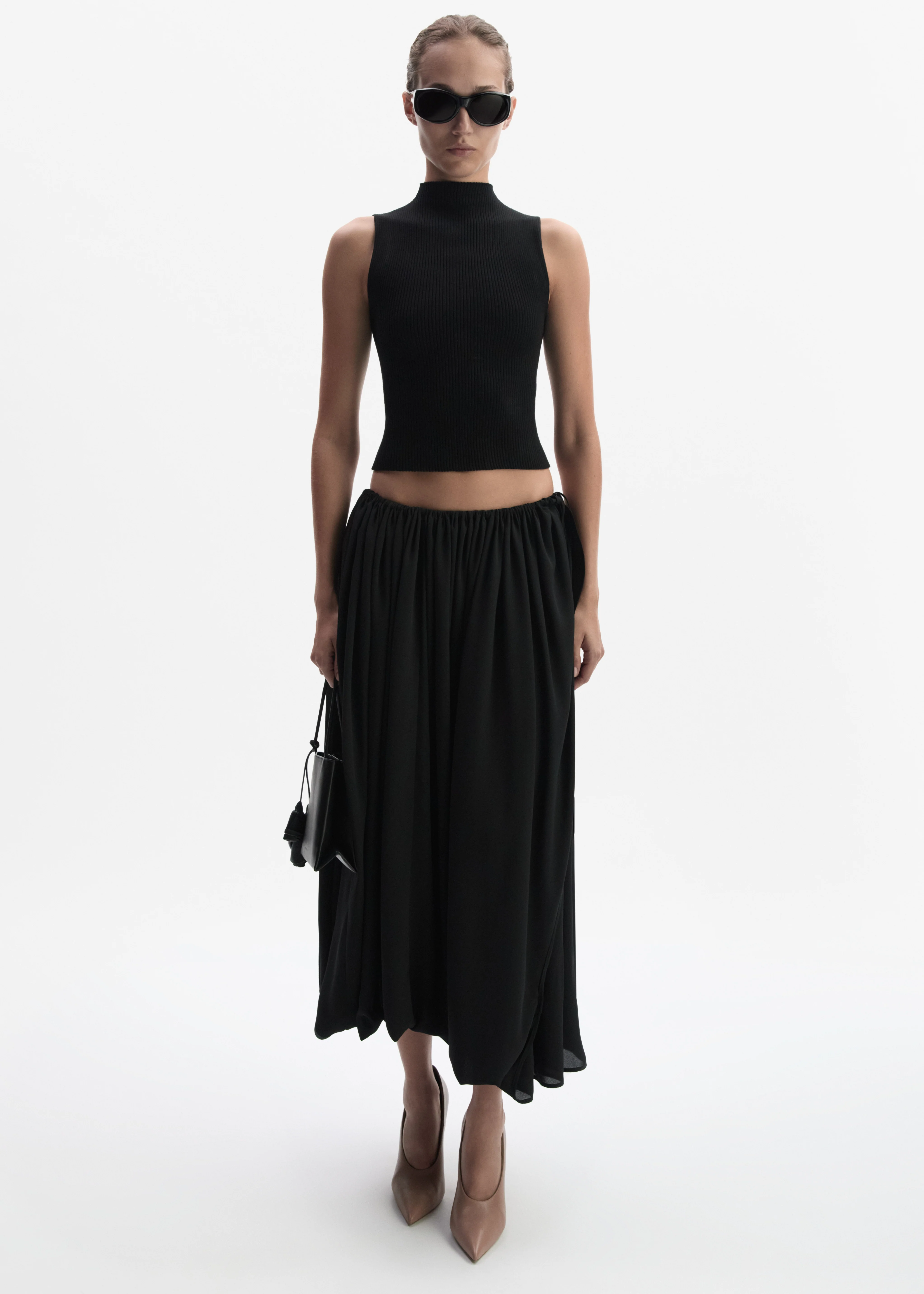 A mid-calf length skirt designed with a elasticated waistband and a refined, fluid silhouette. The outer layer is additionally secured with delicate tie fastenings, creating a subtle wrap effect and soft draping through the front. Finished with a discreet pocket concealed in the left side seam and a hidden zip closure at the centre back.