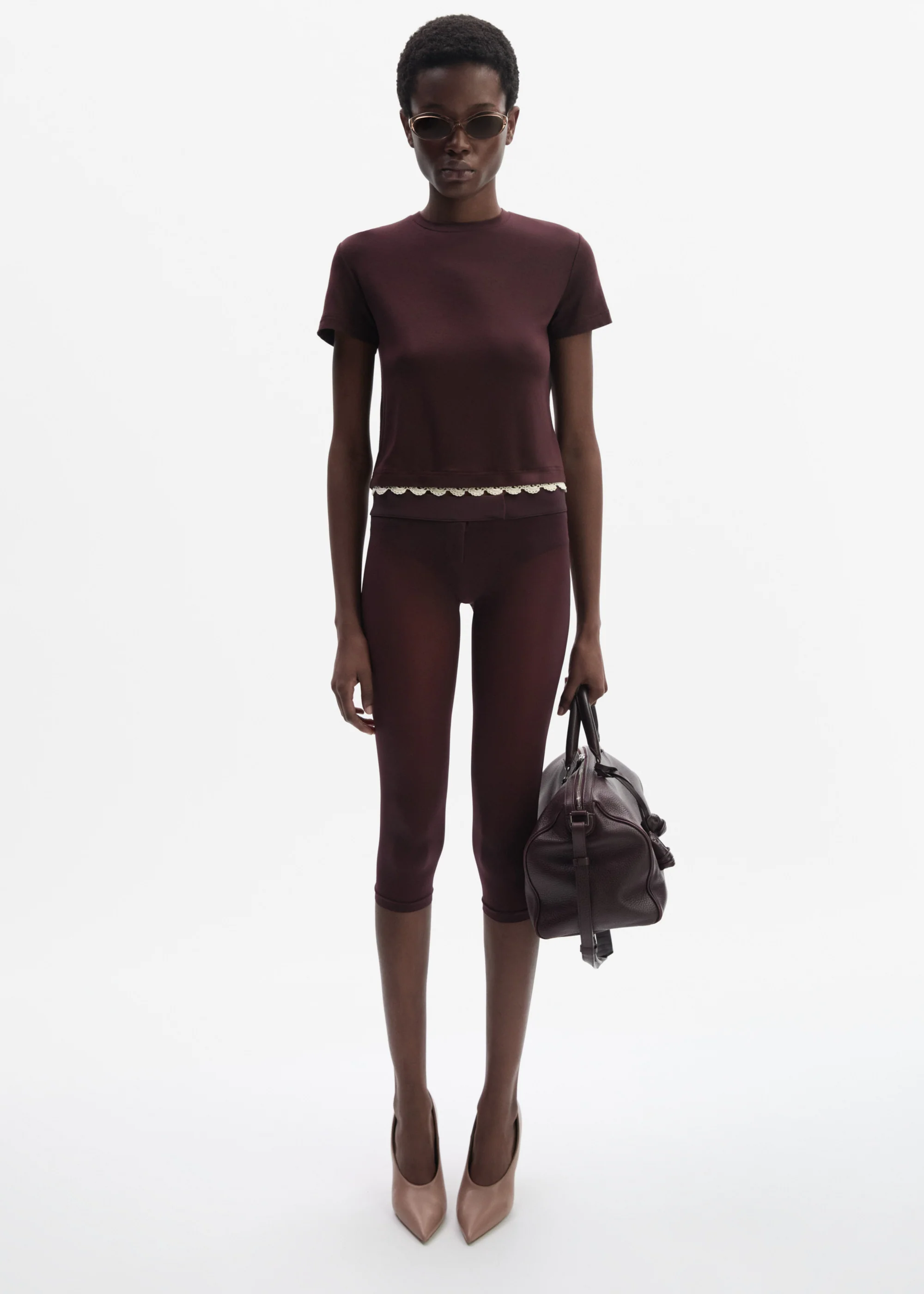 A short-sleeve T-shirt crafted from soft jersey, finished with a classic round neckline detailed with a delicate placket. The silhouette is clean and minimal, contrasted by a crochet lace trim sewn along the hem.
